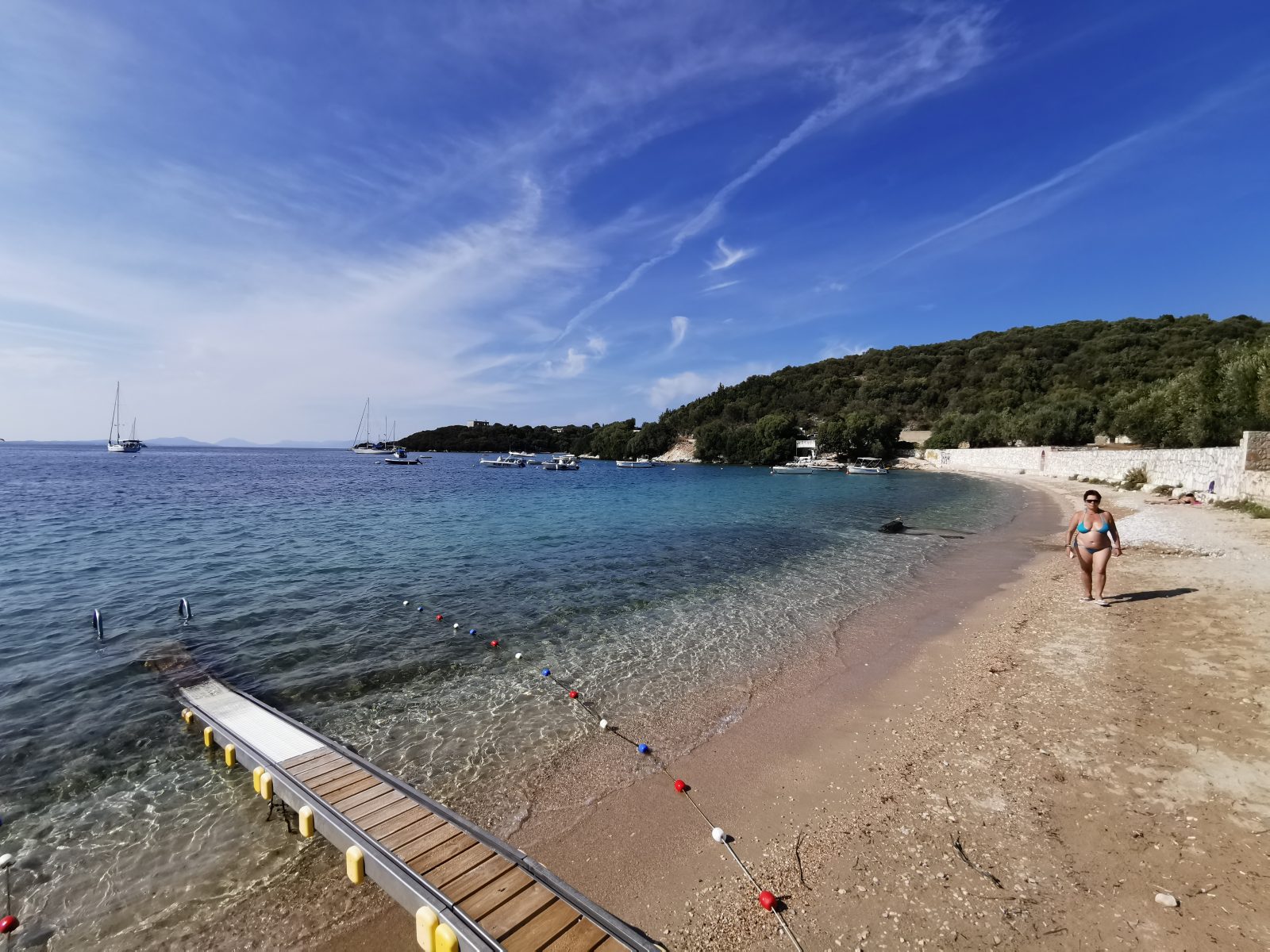 Plaža je sa nešto krupnijim peskom, ali ima odličan ulazak u vodu i duži plićak, tako da je dobar izbor za porodice sa malom decom. Ima ležaljki i suncobrana od okolnih kafića ali i veoma dobre lokacije gde možete postaviti svoj peškir ili suncobran. Plaža je zaklonjena ostrvom od vetra i talasa tako da je voda mirna, a vetrovi slabi.